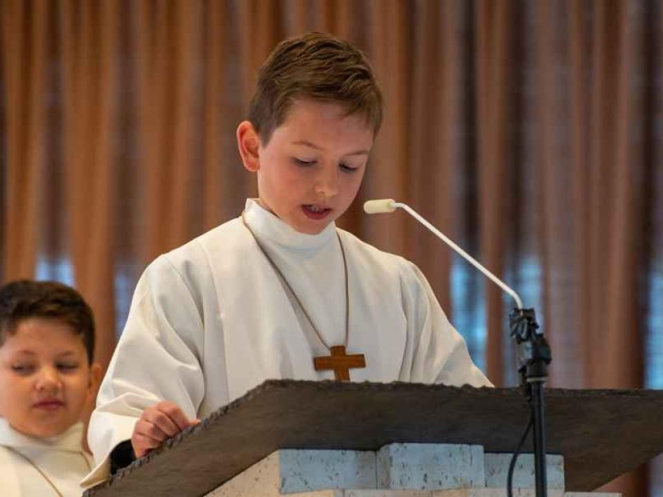 Auf der Treppe, in der wunderbar festlich geschmückten Kirche, waren kleine Schafe mit den Fotos der sieben Kinder platziert. Doch halt, da fehlte doch eines. Sofort machten sich die Erstkommunikanten auf die Suche des verlorenen Schafes und wurden hinter dem Altar fündig. Genauso ist es mit Jesus, erklärte Pater Jaroslaw in seiner Predigt. Immer wieder sucht er Menschen und lädt sie zu sich ein. Verlorene haben immer die Möglichkeit für eine Rückkehr, weil Gott wie ein guter Hirte ist und alle liebt.