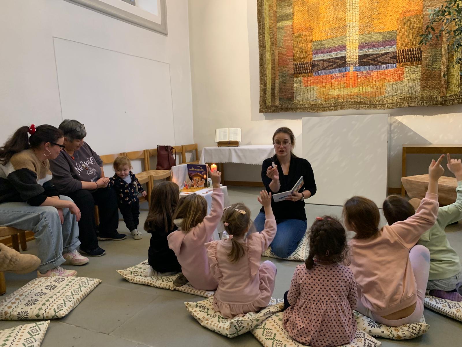 Die Feiern mit den Kleinkinder (bis und mit Kindergarten) sind lebendig, kindgerecht und sinnstiftend. Wir schaffen einen geschützten Raum, in dem Kinder Kirche positiv erleben. Im Zentrum stehen Bilderbücher, Werte wie Vertrauen, Gemeinschaft und Dankbarkeit sowie das gemeinsame Erleben von Glauben.